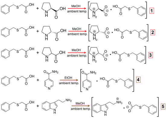 All of the noncovalent-bonded supramolecular architectures, 15, were prepared by using the co-crystallization process that entailed mixing the corresponding N-containing ingredients with (benzylthio)acetic acid (HBTA) at a 1:1 ratio. Well-shaped crystals were then isolated under ambient conditions utilizing the natural solvent-evaporating technique with the addition of short-chained alcohols, due to the similar and high levels of solubility of the title building units in given alcohols. The synthetic pathway for the production of the adducts 15 is depicted in Figure 3, while the procedure of their synthesis is described in detail in the Materials and Methods section. The grown crystals of aggregates 15 were subjected to the SC X-ray diffraction measurements. All complexes crystallized without solvent molecules. The revealed structures showed that the co-crystallization products are identified as zwitterionic co-crystals (13), true co-crystals (4) and true salts (5). The obtained multicomponent crystalline phases were also analysed with FT-IR spectroscopy as well as the thermal analysis.