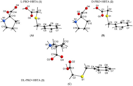 The key H-bonding functional group in the HBTA agent is the acidic moiety. The most specific vibrational mode of the organic acid function is attributed to the carbonyl stretching ν (C=O) of the COOH group. The absorption band associated with this vibrational mode for free HBTA agents is located at 1697 cm−1 (KBr pellet) [16] or 1694 cm−1 (ATR mode) [15], and is characterized by the highest activity in the HBTA spectral profile. In case of adducts 14, the most intense peaks, situated at 1712 cm−1 (1 and 2), 1716 cm−1 (3) and 1699 cm−1 (4), respectively, are connected with the carbonyl stretches originating from the acidic unit. These results point to the fact that the HBTA molecular ingredient after co-crystallization remains in its neutral and protonated form. The observed shifts in the free acid absorption band towards higher wave numbers (higher energies) confirm that the complexes 14 crystallize in the form of co-crystals, which is consistent with X-ray crystal structures. In the spectra of complexes 13, the two absorption bands, corresponding to the stretching νas (COO) and νs (COO) vibrations derived from the negatively charged carboxylate group of the zwitterionic form of proline compounds, are also observed. The peaks connected with the stretching νas (COO) and νs (COO) vibrations of the deprotonated carboxylate group of L-PRO±, D-PRO± and DL-PRO± zwitter ions are located at 1596 cm−1 and 1415 cm−1 for complexes 1 and 2, as well as 1586 cm−1 and 1391 cm−1 for aggregate 3, respectively, which is in line with the spectral data obtained for zwitterionic co-crystals with phenylboronic and 4-iodophenylboronic acids [34]. The zwitterionic form of proline compounds also contains the positively charged NH2+ moiety resulting from the proton transfer from the acidic part to the pyrrolidine nitrogen atom within the molecule, so the two high-energy stretching ν (NH) vibrations of the protonated NH2+ group appeared as a relatively broad and uniquely strong band [35]. In the spectral plots of materials 13, the absorption bands related to the stretching ν (NH) vibrations came from the NH2+ group and are situated at 3414 cm−1 and 3255 cm−1 for enantiomers 1 and 2 as well as 3418 cm−1 and 3143 cm−1 for racemate 3.