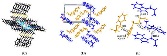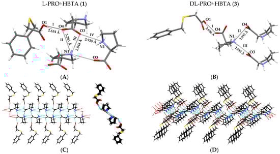 The crystal packing pattern of 3 differs from that observed for the co-crystal of (benzylthio)acetic acid with L-proline and D-proline. The described supramolecular synthons in DL-PRO±·HBTA form a 2D network, as shown in Figure 5D, made of parallel ribbons similar to those observed for co-crystal 1. Moreover, the weak C–H···π interaction between acid molecules and the C‒H···O contact between DL-PRO± and HBTA were determined (Table 2) and they stabilize the 3D supramolecular architecture of co-crystal 3 (Figure 6B,D). The crystallographic unique molecules form an ABAB motif, whereas for co-crystal 1, an AABB arrangement of molecules was observed (Figure 6).