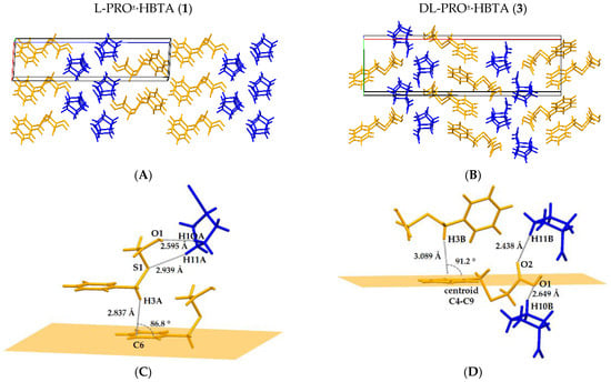 Figure 6. Comparison of crystal packing of 1 (A) and 3 (B) (orange = HBTA, and blue = PRO±) with geometric presentation of weak contacts in crystal 1 (C) and 3 (D).