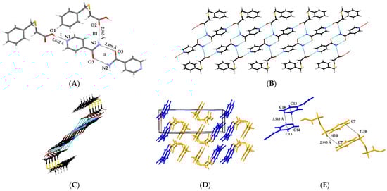 The interaction of the HBTA acid with INA takes place through an O1–H1···N1 hydrogen bond (Synthon I, Figure 8A). Two more hydrogen-bonded synthons are observed in the isonicotinamide co-crystal (Figure 8A). The donation of hydrogen atoms from the NH2 part of the carboxamide group of INA to the carbonyl moiety (a) of other INA molecules (N2–H1···O3) and of (b) carboxylic acid forms (a) a homomeric R22 (8) dimer (Synthon II) and (b) a linear N2–H2···O2 interaction (synthon III), respectively. In crystals, these supramolecular hydrogen bonds generate an infinite ribbon (Figure 8B,C) that is further stabilized by the head-to-head π···π stacking between the INA molecules and the head-to-tail C–H···π interactions between the HBTA molecules forming a 3D, hydrogen-bonded network (Figure 8D,E).
