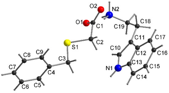 Compound 5 crystallizes in the monoclinic P21 space group with one molecule of each component in the asymmetric unit (Figure 9). The Fourier analysis showed that there is a proton transfer from the carboxyl group of the acid molecule to the NH2 moiety of tryptamine, indicating the formation of a salt: TPA+·BTA. The C1–O1/O2 bond distances of 1.260 (3) and 1.250 (3) Å in the BTA molecule (Table S1) also confirmed the presence of an ionized carboxylic group. The alkyl sulfanyl chain of the HBTA molecule is planar (C1–C2–S1–C3/C2–S1–C3–C4 torsion angles are equal −179.7 (4)°/173.3 (4)°) and the phenyl ring C4–C9 is twisted 73.4 (3)° to the indole ring.