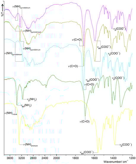 The formation of new products 15 is reflected by the presence of vibrational bands corresponding to the functional groups derived from both co-formers. Additionally, the generation of new crystalline phases 15 is also demonstrated by the occurrence of the appropriate shifts of characteristic stretching vibrations in the FT-IR spectra of adducts 15 in comparison to their positions shown in the spectra of the starting species. The crystal structures of adducts 15 are established via various energetic H-bonds, among which the privileged ones are those formed by the strong functional groups, such as COO/COOH, NH3+/amide as well as the pyrrolidinium/pyridine/indole nitrogen atom, respectively; hence, the strongest shifts of stretching vibrations are related to these beneficial functional groups.