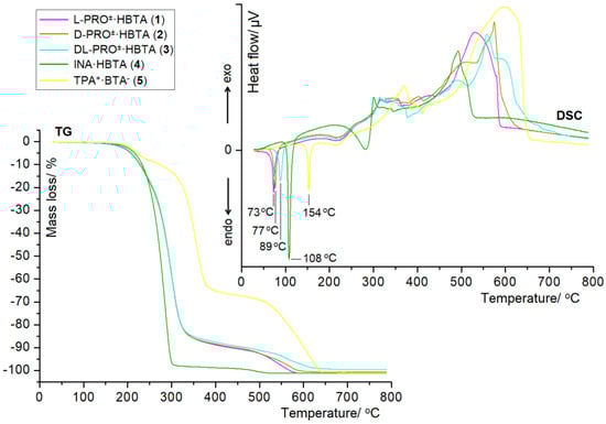 The thermal behaviour of prepared solid supramolecular associations was investigated by simultaneously employing thermogravimetry (TG) and differential scanning calorimetry (DSC). The TG and DSC traces registered for all adducts are illustrated in Figure 12, while the comparison of the TG and DSC thermal curves between the complexes and the free building bricks is shown in Figure S2. The plateaus visible on the TG profiles up to about 100 °C indicate the unsolvated nature of all the supramolecular frameworks. The sharp DSC endothermic dips situated at 73 °C (1), 77 °C (2), 89 °C (3), 108 °C (4) and 154 °C (5) correspond to the melting points of the obtained aggregates. The DSC results revealed that the melting points of all the adducts are distinct from HBTA (64 °C) [15] and the corresponding N-containing co-formers (L-PRO: 234 °C; D-PRO: 227 °C; DL-PRO: 213 °C; INA: 159 °C; TPA: 117 °C), which actually indicates the formation of new crystalline phases. The zwitterionic co-crystals of L-PRO±·HBTA (1), D-PRO±·HBTA (2) and DL-PRO±·HBTA (3) exhibit melting points in between the two components (Figure S2A–C), thus the materials 13 have a much lower thermal stability compared to that of the starting proline agents and a slightly higher thermal stability than that of HBTA. The melting point of the true co-crystal INA·HBTA (4), also found in between the two ingredients (Figure S2D), implies that the INA·HBTA (4) displays a decrease in the thermal stability of isonicotinamide and an improvement in the thermal stability of HBTA. The true salt TPA+·BTA (5) shows a noticeably higher thermal stability than that of the tryptamine and HBTA (Figure S2E), which is due to its higher melting point than that of the initial components. The TG and DSC curves show that all supramolecular adducts decompose only after melting. Among the first exothermic effects reflected on the DSC traces for complexes 15, the one located at a much higher temperature than the others is the exothermic peak with a maximum at 370 °C, which was observed for salt 5. The most intensive exothermic peaks visible on the DSC profiles of compounds 15 are situated around 531 °C, 574 °C, 558 °C, 483 °C and 598 °C, respectively, indicating the dominant stage of the decomposition process of these substances. It is evident from the TG curves that all of the complexes 15 decompose completely without any solid residues.