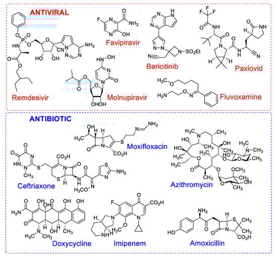 Some medicines of the corticosteroid class—including cortisone, prednisone and methylprednisolone—were also implemented in combination therapies as steroidal anti-inflammatory drugs, as well as prescribed antibiotics, for example, azithromycin, ceftriaxone, moxifloxacin and imipenem [31]. The chemical structures of the main antiviral and antibiotic drugs can be found in Figure 1. The synergistic effect of combination therapies delays the onset of drug resistance, due to the additive effect, increasing the safety and efficacy of the treatment [32].
