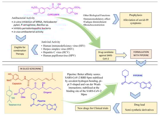 Curcumin, a natural component of Curcuma longa, is one of the most prominent examples of a worldwide consumed condiment which has both antibacterial [83] and antiviral properties [84] (Figure 4). Curcumin diminishes fatigue and bronchoconstriction, helping to alleviate the symptoms of COVID-19 [85]. The antiviral action mechanism of curcumin was recently reviewed [84]. The administration of curcumin in patients with COVID-19 on a formulation containing piperine (a compound that promotes the absorption of curcumin) improved some symptoms, compared to the control group, on a randomized clinical trial [86]. Curcumin is also suggested as a promising prophylactic candidate for the treatment of COVID-19 and is a target of other studies towards the development of nano formulations and supplements [87,88,89,90,91,92,93,94].