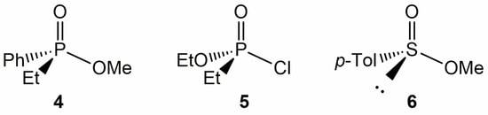 From that time, the other nucleophilic substitution reactions occurring with retention of configuration at the heteroatom centers (see, for example, [3,4]) have been rationalized in terms of the Westheimer’s concept and the addition-elimination mechanism, involving the formation of high-coordinate intermediates and their pseudorotation. However, it should be pointed out here that these transiently formed intermediates have not been isolated or detected by spectroscopic methods due to their instability. Moreover, in this early period of studies on nucleophilic substitution reactions at heteroatoms, it was not possible to make a distinction between the SN2-H and the A–E mechanisms. A solution of this fundamental question was especially interesting for the identity substitution reactions at the chiral phosphorus and sulfur atoms. Taking advantage of the results of theoretical studies on substitution reactions at heteroatoms (P, S, Si) in simple achiral model compounds [5,6,7,8], we performed [9] the DFT calculations for the three symmetrical displacement reactions in the optically active phosphorus and sulfur compounds, as shown below (Figure 1).