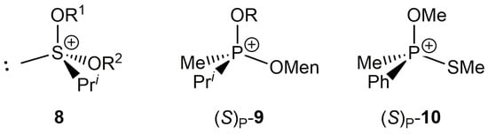 In the hope of gaining further insight into the mechanism of displacement reactions at the sulfur atom, we decided to study the stereochemistry-mechanism relationship in the alkaline hydrolysis of optically active dialkoxysulfonium salts 8. This sulfur structure was selected for our study for two reasons. First, it contains two potential leaving groups bonded to sulfur and their leaving ability and apicophilicity are almost the same. Secondly, it was interesting to compare our results on the hydrolysis of 8 with those reported by DeBruin and Mislow [13,14] on the alkaline hydrolysis of diastereomeric dialkoxyphosphonium salts 9 and alkoxy(alkylthio)phosphonium salt 10 (Figure 2).