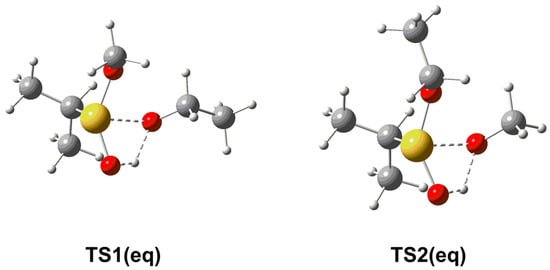 Transition states for the equatorial departure of the alkoxy group, assisted by the apical OH group; color meaning: sulfur—yellow, oxygen—red, carbon—grey, hydrogen—white.