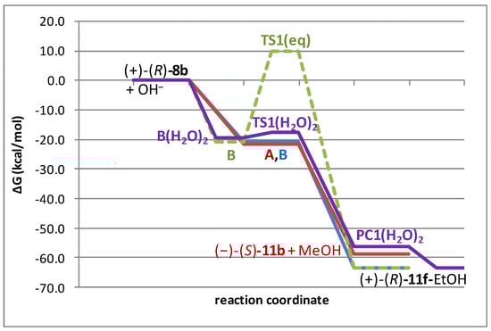 Path 4 involves the attack of the OH(−) opposite the lone pair at the sulfur. This attack leads to a high energy transition state TS-D, which rearranges to E and finally decomposes with the evolution of ROH—as in path 3. However, the barrier associated with the formation of TS-D is so high that it prevents the reaction from proceeding along this pathway. The free energy profiles for the discussed paths 2–4 (for the case where (+)-(R)-11f + EtOH are produced) are presented in Figure 5. The corresponding profiles for the pathways leading to (−)-(S)-11b + MeOH are almost the same. The relative energies of the discussed isomeric sulfuranes and transition states are shown in Table 3.