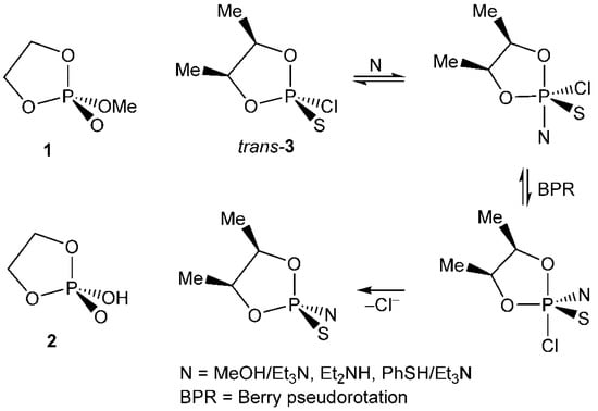 In 1968, Westheimer [1] provided convincing arguments for the operation of the A–E mechanism in the acid-catalyzed hydrolysis of methyl ethylene phosphate 1 (2-methoxy-1,3,2-dioxaphospholan-2-one) and in the 16O–18O exchange reaction in hydrogen ethylene phosphate 2 (2-hydroxy-1,3,2-dioxaphospholan-2-one). A few years later, we provided experimental stereochemical evidence in support of the Westheimer concept of a substitution at P in cyclic five-membered phosphates (PV-intermediate and its pseudorotation) as it was found that the geometrical cis- and trans-isomers of 2-chloro-4,5-dimethyl-1,3,2-dioxaphospholan-2-thione react with nucleophilic reagents, with retention of their configuration at phosphorus [2]—see Scheme 1.