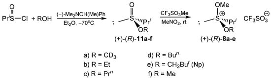 A subsequent reaction of the sulfinates 11a–e with methyl trifluoromethanesulfonate, carried out in nitromethane, afforded the required optically active alkoxy(methoxy)isopropylsulfonium salts 8a–e. As the methylation takes place at the sulfinyl oxygen atom in the sulfinates 11, the configuration at the chiral sulfur atom in the sulfonium salts 8 remains unchanged and is also defined as R in accordance with the Cahn, Ingold and Prelog rules [18]. The values for the optical rotation of the isolated sulfonium salts 8a–e were very low expressing, indicating that their intrinsic asymmetry was extremely small. Selected data on alkyl sulfinates 11, sulfonium salts 8 and sulfinates 11, obtained after their alkaline hydrolysis, are summarized in Table 1.