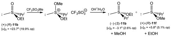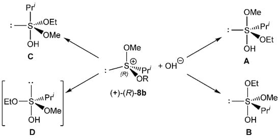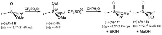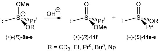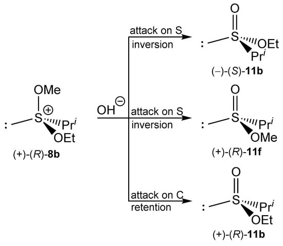 In view of this important statement, the reason why both the hydrolysis products—methyl and ethyl sulfinates 11—are highly racemized, must be due to the other side-processes that accompany the substitution reaction. For a long time, it has been known that the alkoxysulfonium salts R2S+-OR behave as ambident electrophiles [19]. Depending on the nature of a nucleophile, one observes a nucleophilic attack not only on sulfur ions but also on the carbons of alkoxy groups, resulting in de-alkyation. In the case of dialkoxysulfonium salts 8, which are more reactive than their monoalkoxy analogues, the bidirectional attack of the hydroxyl anion has an influence on the stereochemical outcome of the substitution reaction, as well as on the proportions of the two 11 sulfinates formed (see Scheme 11). Whereas the attack of a hydroxyl anion on the sulfur results in the formation of the methyl and ethyl sulfinates 11f and 11b—with the inversion of their configuration at S—the demethylation reaction (the attack of the OH− at the methoxy carbon) leads to ethyl sulfinate 11b, with a retained configuration at the sulfur.
