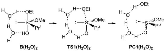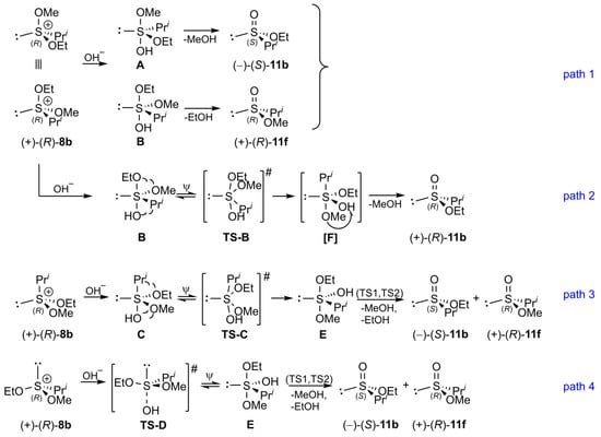 Path 1 is the simplest route, in which the hydroxyl ion approaches the sulfonium cation from the opposite side to one of the alkoxy groups, forming low energy sulfuranes A or B in which two electronegative substituents—OH and OR—occupy the apical positions. In line with the commonly accepted substitution scheme, the departure of the apical group should be facilitated. This scheme implies an inversion of the configuration at the central sulfur atom, leading to (−)-(S)-11b and (+)-(R)-11f as a result of the evolution of MeOH and EtOH, respectively. This process requires the transfer of a proton from the hydroxyl group to the leaving alkoxyl group. Such a transfer is not possible directly. However, in a water solution, it can be easily mediated by solvent molecules. To prove this, we calculated the proton transfer through a bridge of two water molecules. The process, resulting in the substitution of the ethoxy group, is illustrated in Scheme 8. The substitution of the methoxy group proceeds analogously; the calculations confirmed that this process proceeds virtually without an energy barrier.