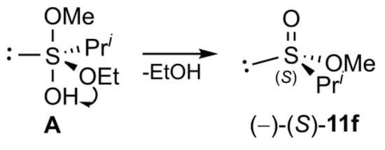 It turned out that with an increase in the steric bulk of the alkoxy group in sulfonium salts 8, the formation of methyl sulfinate 11f gradually decreased. In the case of the alkaline hydrolysis of methoxy(neopentoxy)sulfonium salt 8e, methyl sulfinate 11f was not formed. A small amount of methyl sulfinate 11f that formed upon the hydrolysis of the sulfonium salts 8c and 8d was the main reason that our attempts to obtain this ester in a pure state by preparative gas chromatography were unsuccessful. Moreover, it is reasonable to assume that the other methyl sulfinates 11f are formed in these hydrolysis reactions with an inversion of their configuration and that are highly or completely racemized due to the side reactions discussed below. As sulfinates 11b–e were the major hydrolysis products of salts 8b–e, they were obtained in a pure state by preparative gas chromatography—although with a low yield. All these esters were highly racemized but formed with a predominant inversion of their configuration at the sulfur.