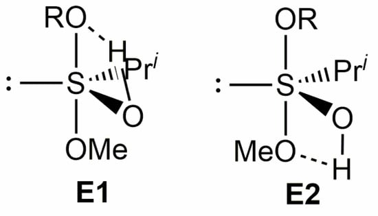 Path 3 assumes the attack of the OH(−) opposite the iPr group, with an initial formation of the high energy structure C with apical iPr and OH groups and equatorial alkoxy groups. Departure from the equatorial position is accompanied by a high energy barrier (see discussion of path 1)—so, another possibility is pseudorotation (TS-C), which gives a structure with alkoxy groups in the apical positions €. The E structure is the most stable among the sulfurane structures considered. Scheme 10 shows two isoenergetic conformers of E, differing in the orientation of the OH bond, which interacts with the alkoxy oxygen to facilitate the departure of the OMe or OEt groups, respectively. The transition states TS1 and TS2—leading to the elimination of EtOH or MeOH, respectively—are, by only about 1 kcal/mol, higher in free energy than the corresponding E1 and E2 sulfuranes. However, the transition state for Berry pseudorotation (TS-C) is also relatively high in energy (Figure 5).