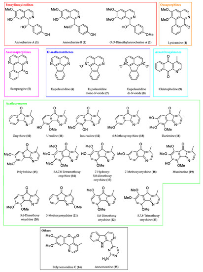 Over decades, unique bioactive secondary metabolites have been isolated from Annonaceae. Acetogenins, a class of C35/C37 metabolites derived from long chain (C32/C34) fatty acids in the polyketide pathway, represent a very prominent chemotype among Annonaceae constituents. Exhibiting impressive antitumor activity, they, nonetheless, never reached the market due to severe toxicity, especially neurotoxicity [2]. A second prominent group of natural products from Annonaceae which received considerable interest in drug development are polycyclic aromatic alkaloids, most of which are biosynthetically derived from aporphinoid precursors. Oxoaporphines, well-known tetracyclic metabolites from the benzylisoquinoline pathway, are speculated [3,4] to undergo further transformations—including ring cleavage—during late-stage metabolism, as depicted in Figure 1. These proposed biotransformations produce unique tri- and tetracyclic aromatic alkaloids like azafluorenones, diazafluoranthenes, and azaoxoaporphines. Typical of the biosynthetically well-studied tyrosine-derived aporphinoid alkaloids, these natural products bear characteristic hydroxylation and methoxylation patterns.