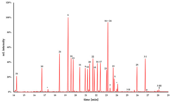 Total ion chromatogram of the compounds 3–25; 3 O,O-dimethylannocherine A, 4 lysicamine, 5 sampangine, 6 eupolauridine, 7 eupolauridine mono-N-oxide, 8 eupolauridine di-N-oxide, 9 cleistopholine, 10 onychine, 11 ursuline, 12 isoursuline, 13 6-methoxyonychine, 14 darienine, 15 polyfothine, 16 5,6,7,8-tetramethoxyonychine, 17 7-hydroxy-5,8-dimethoxyonychine, 18 7-methoxyonychine, 19 muniranine, 20 5,6-dimethoxyonychine, 21 3-methoxyonychine, 22 5,8-dimethoxyonychine, 23 5,7,8-trimethoxyonychine, 24 polynemoraline C, 25 annomontine; * impurities. Due to the individual volatility and thermal stability of the compounds, different concentrations were used in order to obtain a chromatogram visualizing the chromatographic behavior of all analytes (3 100 µg/mL, 4–6 20 µg/mL, 7, 8 50 µg/mL, 9–25 and IS 20 µg/mL.