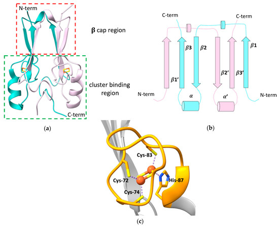 (a) Crystallographic structure of the soluble domain of human mitoNEET, with highlighted the β-cap and the cluster-binding regions (PDB ID: 2QH7). The two subunits forming the dimer are reported in different colors; (b) topology diagram illustrating the organization of the secondary structural units in the two protomers of the dimeric structure of mitoNEET; (c) [2Fe-2S] cluster-binding motif of human mitoNEET. The conserved CXCX2(S/T)X3PXCDG(S/A/T)H motif is highlighted in orange.