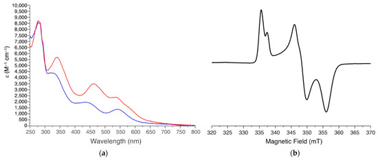 UV-visible (UV-vis) spectroscopy has been widely used to characterize the oxidized and reduced states of the two [2Fe-2S] clusters of mitoNEET [18,50] to follow their redox properties [36,39,40], to investigate the cluster transfer activity of mitoNEET as a function of pH [34,35,41], and to characterize the system in the presence of ROS species [35,41]. Indeed, the UV-vis spectra of oxidized and reduced mitoNEET are significantly different, thus allowing the changes in the redox state of the clusters to be easily followed. The UV-vis spectrum of oxidized [2Fe-2S]2+ mitoNEET shows intense absorption bands at ~340 and 458 nm and bands with lower intensity between 535 and 580 nm (Figure 2a) [35,41]. This pattern resembles that of several types of [2Fe-2S] cluster-containing proteins, including all-Cys ferredoxin [51] and Rieske Fe-S proteins [52]. Therefore, as observed for Rieske proteins, the presence of a N donor atom in the first coordination sphere does not affect the optical properties of tetrahedral Fe3+ ions.