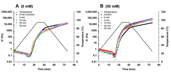 Change in storage modules (G′) during the heating–cooling cycle of soy protein isolate treated by varying ultrasound processing times (0, 5, 10, 20, and 30 min) at different NaCl concentrations at 0 mM (A), 50 mM (B), 100 mM (C), 200 mM (D), 300 mM (E), and 600 mM (F).