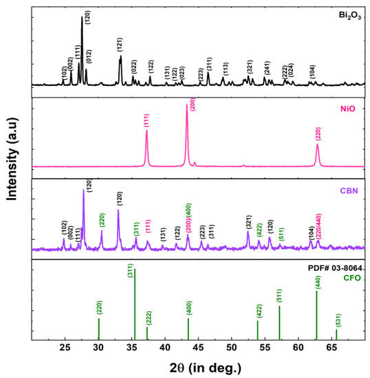 Similarly, the NiO XRD pattern is indexed for (111), (200), and (220) planes, respectively, corresponding to the face-centered cubic structure in accordance with JCPDS file #04-0835 [40]. The observed hkl peaks (102), (002), (111), (120), (121), (223), (321), (241), and (104) in the case of CBN are assigned to the Bi2O3 structure. The presence of (111), (200), and (220) peaks corresponds to the NiO phase. The observed peaks (220), (311), (400), (422), (511), and (440) are assigned to the cubic phase structure of cobalt ferrite [41]. The presence of a characteristic peak for Bi2O3, NiO, and CFO confirms the successful formation of composites and the retention of the pure structure of bare samples.