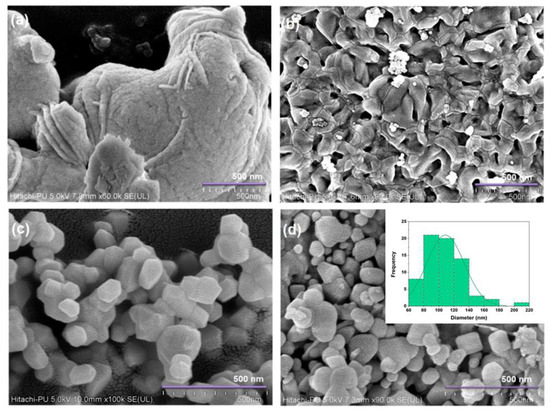 The surface morphology of the synthesized catalysts is studied by analyzing SEM images. For comparison purposes, all SEM images are recorded at the same scale of magnification. Figure 2a–d presents the SEM image for the Bi2O3, NiO, cobalt ferrite (CFO), and CBN heterojunction. The bare Bi2O3 exhibits a dense and quite stacked morphology (sheet-like), while NiO nanoparticles are accompanied by a uniform and interconnected morphology of grains. The cobalt ferrite (CFO) nanoparticles have uniform distribution of grains with clear visibility. In the case of CBN, small, medium, and some large grains can be visualized. This is further verified by analyzing the grain size distribution plot (inset Figure 2d) which demonstrates the wide distribution of the grains in the CBN sample. The average grain size appears to be 100–120 nm. This is expected because of the different grains of constituent oxides of CBN. The junction shows intimate contact between the semiconductors, which is beneficial for rapid charge-transfer.