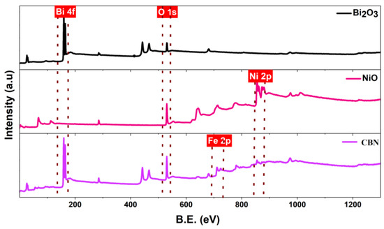 The X-ray photoelectron spectroscopy (XPS) technique has been used to investigate the chemical states, element confirmation, element environment, and presence of any defects on the surface of the catalyst. Nevertheless, XPS is a crucial tool for exploring charge transfer in heterojunctions. Figure 4 shows the X-ray survey scan spectrum for Bi2O3, NiO, and CBN photocatalysts. Bi2O3 XPS spectra confirm the presence of Bi 4f, Bi 4d, and O 1s states in the sample. Similarly, Ni 2p and O 1s states are confirmed for the NiO sample. On comparing the CBN spectra with the bare samples, a slight shift can be observed in the Ni 2p, Bi 4f, and O1s states. The shifting is an indication of the successful formation of the heterojunction. The elemental percentage derived from the XPS spectra of CBN photocatalyst is listed in Table S1. More information can be gathered by analyzing the core-level spectra of individual element states.