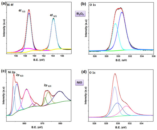 De-convoluted core level spectra for (a,b) Bi2O3 (Bi 4f and O 1s spectra), (c,d) NiO (Ni 2p and O1s spectra).