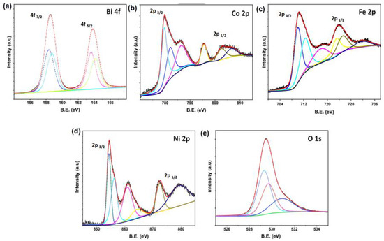 De-convoluted core level spectra for CBN (a) Bi 4f, (b) Co 2p, (c) Fe 2p, (d) Ni 2p, and (e) O 1s spectra).