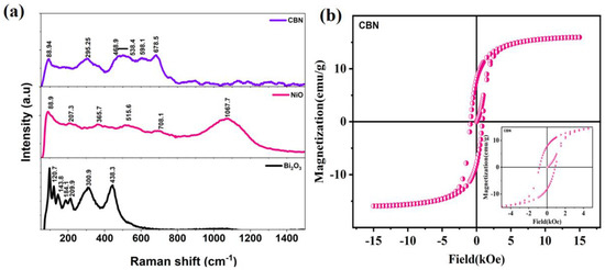 (a) Vibrational modes observed for Bi2O3, NiO, and CBN catalysts in Raman spectra (b) Hysteresis loops for CBN, inset: Zoomed in around origin of M-H curve.