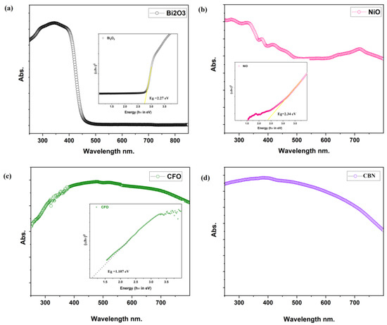 (a–d). Absorbance spectra for Bi2O3, NiO, CFO, and CBN catalysts. Inset: Tauc plot for bandgap calculation.