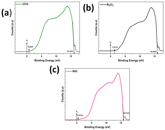 (a–c) UPS spectra for CFO, Bi2O3, and NiO.