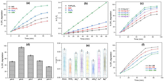 (a) Photocatalytic removal of OFL (a) Photodegradation under visible light (b) Corresponding pseudo-first-order kinetic plots; effect of reaction parameters on OFL removal under visible light with CBN photocatalyst (c) Catalyst dosage (d) Initial solution pH (e) Common electrolytes (f) Solar light and water source [photocatalyst] = 0.4 mg/mL; [pollutant] = 10 mg L−1, initial pH = 5, temperature = 30 ± 0.5 °C.