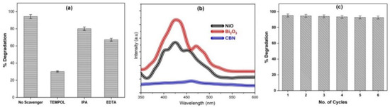 The reaction occurs at pH = 5; hence, the route via OH− is ruled out. In addition, the holes on VB of Bi2O3 cannot generate ●OH radicals, as potential is lower than E(●OH/H2O) = 2.27 eV vs. NHE [65]. The movements of electrons are also supported by XPS measurements. The charge separation and reduced recombination in the CBN heterojunction are also supported by the photoluminescence (PL) spectra (Figure 11b). As can be seen, NiO and Bi2O3 both show very high PL intensities because of their lower bandgaps, which increase recombination. However, the PL curve is almost flattened for the CBN junction, thereby suggesting high charge separation by effective Z-scheme transfer.