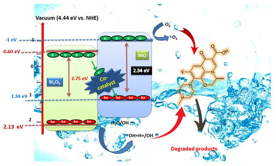 The CoFe2O4 nanoparticles act as redox mediators, which support the facile indirect Z-scheme transfer of photogenerated electrons from CB of Bi2O3 towards VB of NiO as Bi2O3 → CoFe2O4 → NiO or Bi2O3 → Fe2+/Fe3+ → NiO or Bi2O3 → Co2+/Co3+ → NiO. The Fe2+/Fe3+ redox cycle can easily transfer electrons in a facile manner and thus support the separation of charge carriers. In addition, the electron transfer may take place from CoFe2O4 towards the CB of NiO to generate more ●O2− radicals which boost the OFL degradation. The ferrite nanoparticles also improve the visible absorption of the junction and provide magnetic character to the photocatalyst for better separation and recovery.