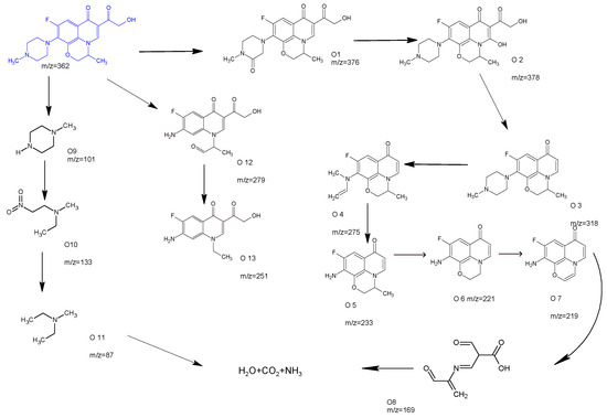 Further, LC-MS was employed to detect and analyze the OFL degradation intermediates, and a possible degradation route was proposed as shown in Scheme 1. The first typical pathway involves attack by holes/●O2− on the piperazine ring in a parent molecule (m/z = 362) to form intermediates O1 (m/z = 376) and O2 (m/z = 378). Further oxidation leads to cleavage of the C-C bond in the ring, N-dealkylation, and formation of O3 (m/z = 318). The O3 intermediate forms O4 (m/z = 275) via opening of the piperazine ring. The further dealkylation of O4 leads to O5 (m/z = 233) and O7 (m/z = 219). The ring opening then leads to the formation of (m/z = 169). The degradation intermediates detected are in accordance with previously reported works [62,63]. In the second degradation route, the C-N bond cleavage occurs due to radicals to form intermediates O9 (m/z = 101), and further cleavage of the piperazine ring forms O10 (m/z −133) and O11 (m/z = 87) [4]. In the third route, the parent molecule (m/z = 362) leads to formation of O12 (m/z = 279) with amino group removal via piperazine epoxidation. Subsequent radical attack forms product O13 (m/z = 251). The results are in agreement with previous findings [64]. The repeated attacks by the reactive oxygen species leads to formation of lower molecular weight aliphatic molecules, and mineralization in the longer run. This was further ascertained by high total organic carbon (TOC) removal (Figure S5). The order of TOC removal under visible light irradiation for a 2 h experiment using CBN as the photocatalyst was: CBN + UW + Visible (83.4%) > CBN + RW + Visible (77.6%) > CBN + UW + Solar (72.1%) > CBN + RW + Solar (62.2%). High TOC removal in the visible light, solar light, and river water matrix suggests that the CBN photocatalyst has competent mineralization capacity, which increases with longer runs.