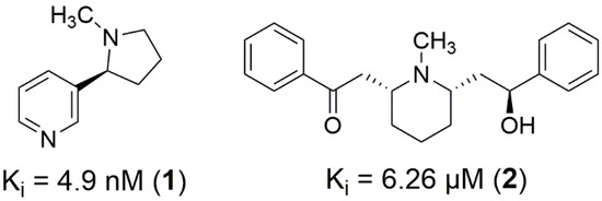 2D structures of nicotine (1) and lobeline (2), followed by Ki values for (α4)2(β2)3 and α7 nAChRs subtypes, respectively.