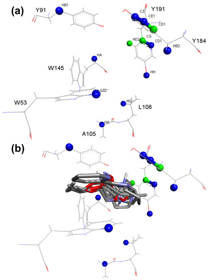 The overlay shown in Figure 2 reveals common regions for the most well-behaved ligands that were used in the construction of the pharmacophore map presented in Figure 3. A characteristic sphere was created for positively charged atoms where there was an overlap of basic functional groups, also representing the contact with A:Y204:CG because this interaction is implicated in the proximity of the α-N atoms of the ligands with A:Y204 residue. In this same region, a hydrogen bond donor vector oriented in the direction of A:W156:C was modeled. The contact with A:T157:HG23 is represented by a sphere of hydrogen bond acceptor because it is believed that the proximity to this atom is due to the water molecule in the binding site. Additionally, close to this point, an aromatic ring sphere was built where this type of subunit overlapped. The contact with B:F119:CB is represented by a hydrophobic sphere. This sphere is not positioned in an atom once this contact occurs due to the interaction with the phenyl ring of the residue.
