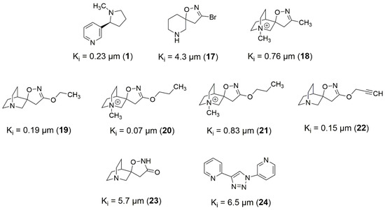 In fact, recent studies indicate that partial and full agonists of α7 nAChRs are effective in the treatment of neurological disorders such as schizophrenia and Parkinson’s disease and also in the control of drug-induced motor disorders, such as levodopa-induced dyskinesias which arises during the course of Parkinson’s disease treatment [6,7,8,9,10]. Concerning the α4β2 subtype, partial and full agonists have also been reported as promising ligands for conditions such as depression and nicotine addiction [11,12].