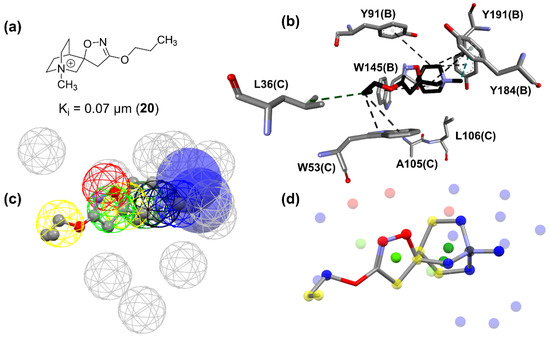 Characteristics and docking pose of ligand 20. (a) 2D structure, (b) best docking pose and its interactions with α7 orthosteric site, (c) 20 structure in pharmacophore map, (d) structural and molecular features. (b) Nitrogen atoms are shown in blue, oxygen atoms in red; hydrogen atoms were omitted for clarity and carbon atoms in gray (amino acids) or black (ligand). Molecular interactions are shown as dotted lines: alkyl-alkyl in green, π-sigma in cyan, and π-alkyl in black. (c) Meshed spheres are shown as follows: exclusion spheres in gray; hydrogen bond acceptor regions in red; non-planar rings in dark green; positively charged regions in black; planar rings in light green; hydrophobic regions in yellow; hydrogen bond donor regions in blue. Blue opaque spheres represent directions of hydrogen bond donor atoms. (d) Small spheres represent molecular features and are shown as follows: proton acceptor regions in red; planar rings in light green; non-planar rings in dark green; hydrophobic regions in yellow; positively charged regions in black; hydrogen bond donor regions in blue.