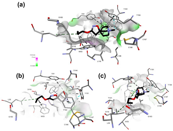 Best docking pose of 20 and hydrogen bond potential surface of α7 receptor binding pocket. Nitrogen atoms are shown in blue, sulfur in yellow, oxygen atoms in red, hydrogen atoms were omitted for clarity and carbon atoms in gray (amino acids) or black (ligand). Molecular interactions are shown as dotted lines: alkyl-alkyl in green, π-sigma in cyan, and π-alkyl in black. (a–c) correspond to different site views.