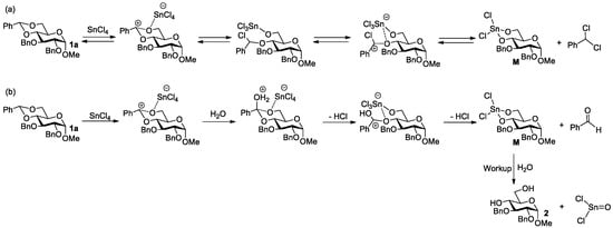 We first evaluated the potential of SnCl4 to remove the 4,6-O-benzylidene group of glycosides using methyl 2,3-di-O-benzyl-4,6-O-benzylidene-α-D-glucopyranoside 1a as a model compound. Thus, 1a was allowed to react with SnCl4 in DCM at rt (Table 2). Interestingly, as the used amount of SnCl4 was gradually increased from 0.2 equiv to 2.5 equiv, the yield of the deacetalation product 2 increased from 19% to a nearly quantitative yield (Entries 1–3). These results seem to support an equilibrium reaction. The reaction mechanism is proposed in Figure 1a, where the coordination of SnCl4 to the 4,6-oxygen atoms of 1a leads to the cleavage of the benzylidene group, and the formation of the intermediate M and dichlorotoluene. However, we failed when we tried to capture dichlorotoluene by an NMR experiment to support this mechanism (Figure S1 in SI). The fact that benzaldehyde was captured instead of dicholorotoluene supports the mechanism shown in Figure 1b, where trace amounts of water play an indispensable role in the cleavage of the benzylidene group. The mechanism also explained why it is not feasible to use a catalytic amount of SnCl4 in the reaction. When the solvent used in the reaction was changed from DCM to the more polar methanol and acetonitrile, the yields of 2 were greatly reduced (Entry 4). The reason must be due to the competitive coordination of SnCl4 with polar solvents.