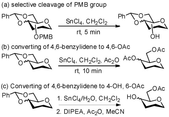Orthogonally protected glycosyl building blocks play key roles in the synthesis of oligosaccharides, whose preparation usually requires multiple steps of selective protection and deprotection [1,2,3,4,5,6,7]. Acetalation is a routine manipulation for protecting the 4- and 6-hydroxyl groups of glycosides in the synthesis of glycosyl building blocks [8,9,10,11,12,13,14,15,16,17], and thus methods for removing 4,6-arylidene acetals were extensively reported [18,19,20,21,22,23,24,25,26,27,28,29,30,31,32,33]. Acidic hydrolysis of the 4,6-arylidene group is the most commonly used method, including the use of AcOH [18,19], CF3COOH [18,19], VO(OTf)2 [20], Er(OTf)3 [21], SnCl2 [22], NaHSO4 [23], I2 [24] and so on (Entries 1–7 in Table 1). Improved methods included the combined use of Lewis acids and dithiols (Entries 8–9) [25,26], and the use of silica gel supported acids (Entries 10–15) [27,28,29,30,31,32]. In addition, an improved method for deprotection of the 4,6-arylidene group under hydrogenation conditions was to use Et3SiH instead of H2 (Entry 16) [33]. These methods each have their own advantages and disadvantages, and the disadvantages usually include relatively harsh conditions, long reaction times, incompatibility with many functional groups and the formation of unwanted byproducts. SnCl4, as a Lewis acid, was used in the selective removal of benzyl groups in carbohydrate synthesis, but exhibited relatively low reactivity [34]. Considering the difference in the stability of benzyl and benzylidene under acidic conditions, we then attempted to use SnCl4 to achieve rapidly and highly selective removal of acetal and ketal groups. In this study, we found that treatment of carbohydrates containing acetal/ketal groups with SnCl4 ith the assistance of water in CH2Cl2 (DCM) led to deacetalization/deketalization products in almost quantitative yields. For substrates containing both acetal/ketal and PMB groups, we also found that the PMB group was selectively cleaved by the use of a catalytic amount of SnCl4 in DCM, while the acetal/ketal groups remained (Scheme 1a). Furthermore, based on SnCl4-promoted deacetalization, 4,6-benzylidene glycosides can be conveniently converted to 4,6-OAc glycosides (Scheme 1b) or 4-OH, 6-OAc glycosides (Scheme 1c).