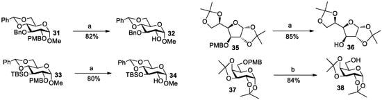 We also noticed that the 4-methoxylbenzyl (PMB) protecting group could be deprotected in the presence of catalytic amounts of SnCl4 [36]. The catalytic mechanism involved the formation of the desired alcohol, the release of a PMB cation, and the subsequent formation of a lipophilic side product through the Friedel–Crafts alkylation of the PMB cation with another PMB ether [37,38]. Indeed, after treatment of methyl 2,4,6-tri-O-acetyl-3-O-PMB-galactoside/mannoside 27/29 with 0.2 equiv of SnCl4 in DCM at rt for 10 min, the PMB-removed products 28/30 were obtained in 92/98% yield (Entries 9 and 10). Since the reactivity for removing PMB is much higher than that for removing acetal/ketal by SnCl4, we guessed that PMB should be preferentially removed from substrates containing both PMB and acetal/ketal in the presence of catalytic amounts of SnCl4. Therefore, four substrates 31, 33, 35 and 37 containing both PMB and acetal/ketal were treated with 0.2–0.5 equiv of SnCl4 in DCM at rt for 5 min, leading to the selective PMB-removed products 32, 34, 36 and 38 in 80–85% yields (Scheme 2).