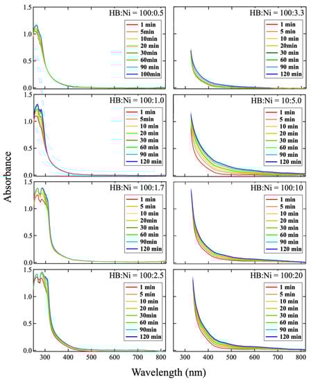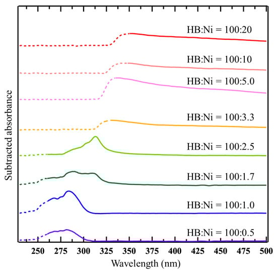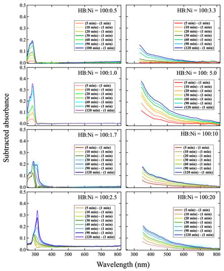 In Figure 1, the wavelength of the absorbance changes according to the concentration of Ni ions. To study the change, each spectrum was subtracted by the spectrum captured at 1 min after mixing, as shown in Figure 3. In the case of a lower Ni concentration (HB:Ni = 100:0.5, HB:Ni = 100:1.0, and HB:Ni = 100:1.7), the absorbance in the range of 250–300 nm increases with time after mixing. For a higher Ni ion concentration (HB:Ni = 100:2.5, HB:Ni = 100:3.3, HB:Ni = 100:5.0, HB:Ni = 100:10, and HB:Ni = 100:20), the absorbance ranging from 320 to 800 nm increases with time after mixing. The change in the absorption feature as a function of the Ni ion density is highlighted in Figure 4, where a representative subtracted spectrum when the spectrum change is saturated is shown. The absorbance peak position shifts to the longer wavelength as the Ni ion concentration increases.