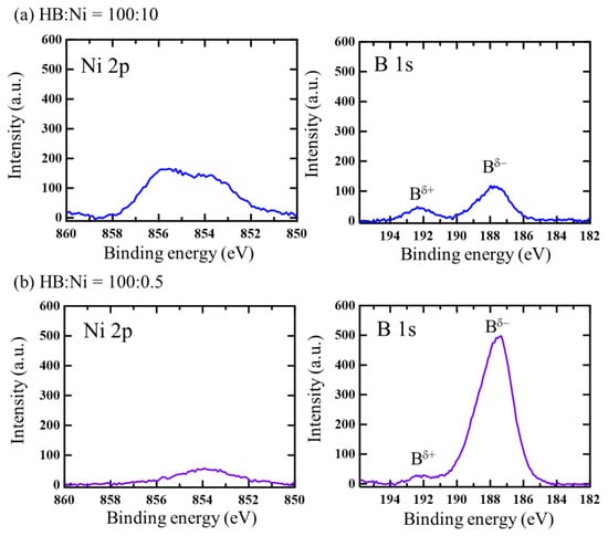 It should be noted that the appearance of oxide Ni peak for the sample with HB:Ni = 100:10, shown in Figure 2a, may arise from the surface oxidation of Ni nanoclusters because of the need to expose the sample to air before setting it in the XPS load-lock chamber. A similar spontaneous reduction reaction has also been reported in the formation of nanocomposites using graphene [], layered CaSi2 [], polysilane [], and Mg-deficient hydroxyl-functionalized boron nanosheets [].