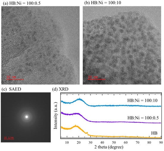 TEM images SAED pattern and XRD patterns. (a) TEM images of HB:Ni = 100:0.5, and (b) HB:Ni = 100:10. (c) SAED pattern simultaneously obtained with the TEM image shown in panel b. (d) XRD patterns of HB, HB:Ni = 100:0.5, and HB:Ni = 100:10 (a Kapton capsule was used as a cover of the sample to prevent the exposure of the sample to the atmosphere). The XRD pattern of HB shows a small peak at 27°, which is considered to be originated from the stacking of some of the sheets.