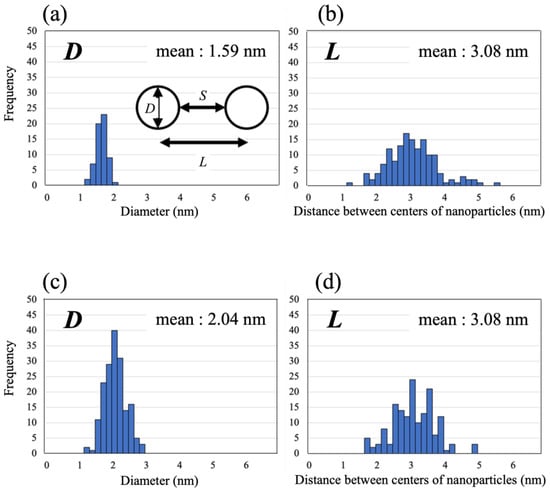 Histograms of (a,c) diameter, (b,d) distance between centers of nanoparticles. (a,b) are the results at HB:Ni = 100:0.5, (c,d) are the results at HB:Ni = 100:10.
