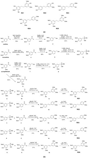 Resveratrol derivatives were obtained from chemical synthesis starting from aromatic aldehydes (vanillin and isovanillin) as described in Materials and Methods. We aimed to gain five novel resveratrol derivatives, which are 5-(4-hydroxy-3,5-dimethoxyphenethyl)-2-methoxy-3-methylphenol (RD1), 4,4′-(ethane-1,2-diyl)bis(2-methoxyphenol) (RD2), 4-(3-hydroxy-4-methoxyphenethyl)-2-methoxyphenol (RD3), 4-(3-hydroxy-4-methoxyphenethyl)-2,6-dimethoxyphenol (RD4), and 4,4′-(ethane-1,2-diyl)bis(2,6-dimethoxyphenol) (RD5) (Figure 1a).